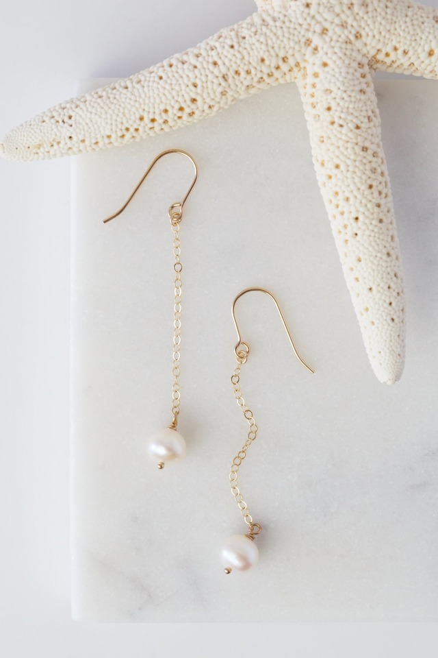 可愛らしいパールがブランコのようにスウィングするピアスです。 目立ちすぎない大きさながら動きがあって華やかです。 全長 5cm (ピアスパーツ下から4cm) 素材 パール チェーン 14GF ピアスパーツ 14GF