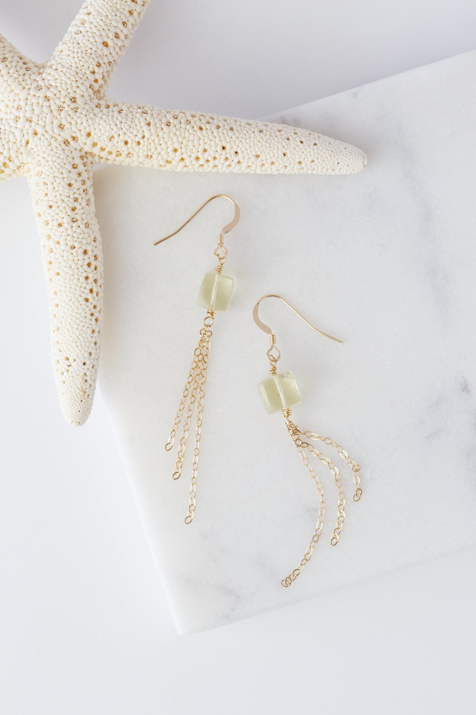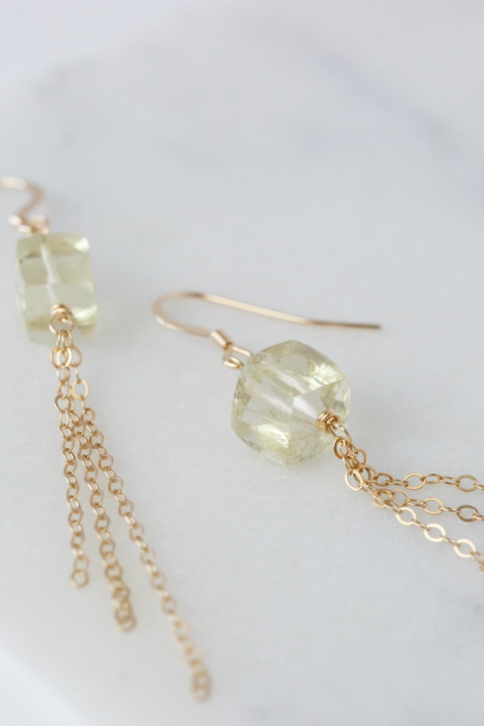 ハワイやLAの太陽を思わせるレモンクオーツの珍しいキューブ型+チェーンピアスです。