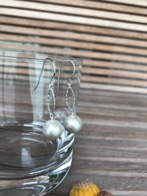 コットンパールとシルバーのオーバルパーツで存在感のあるピアスです。