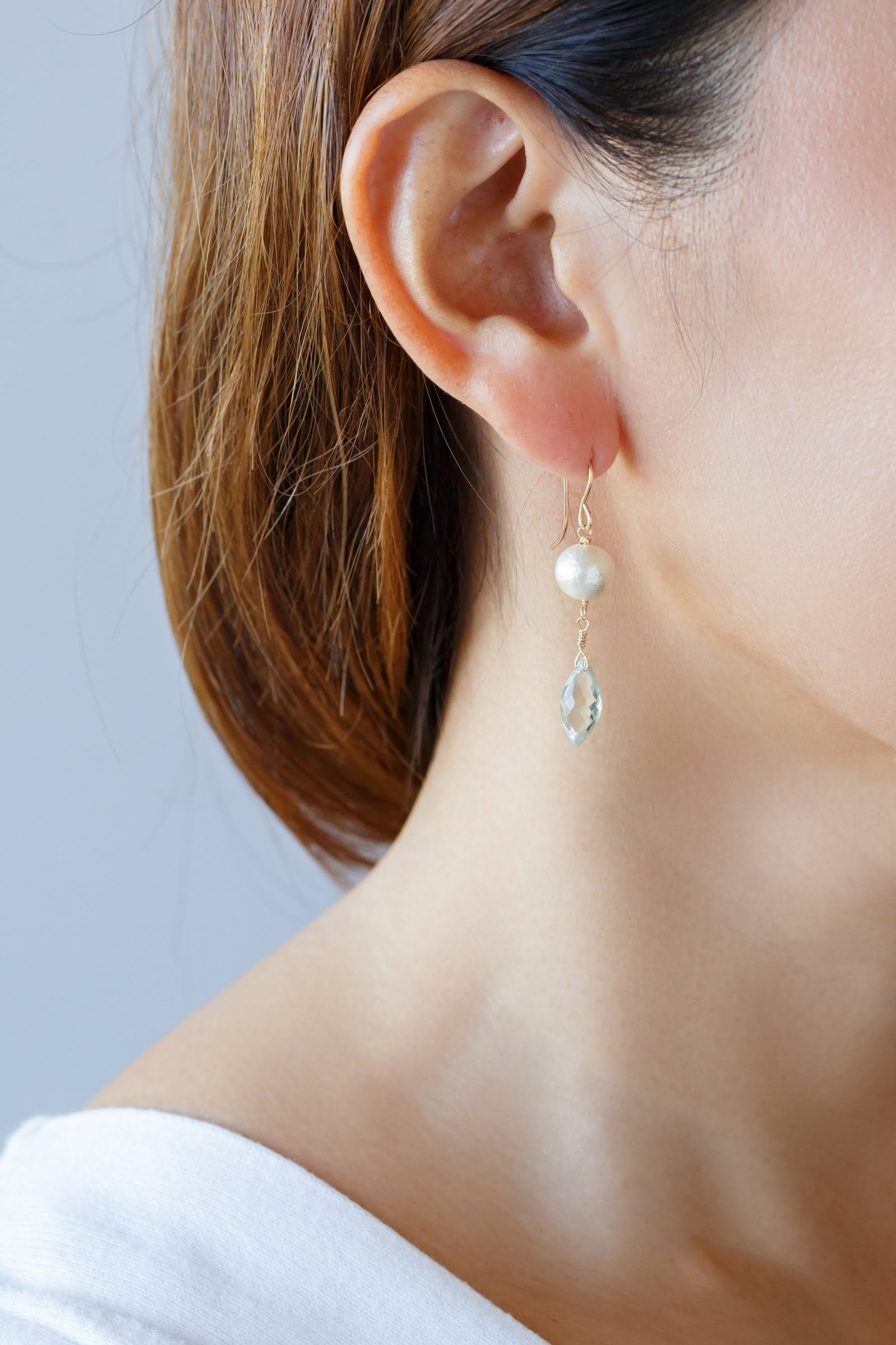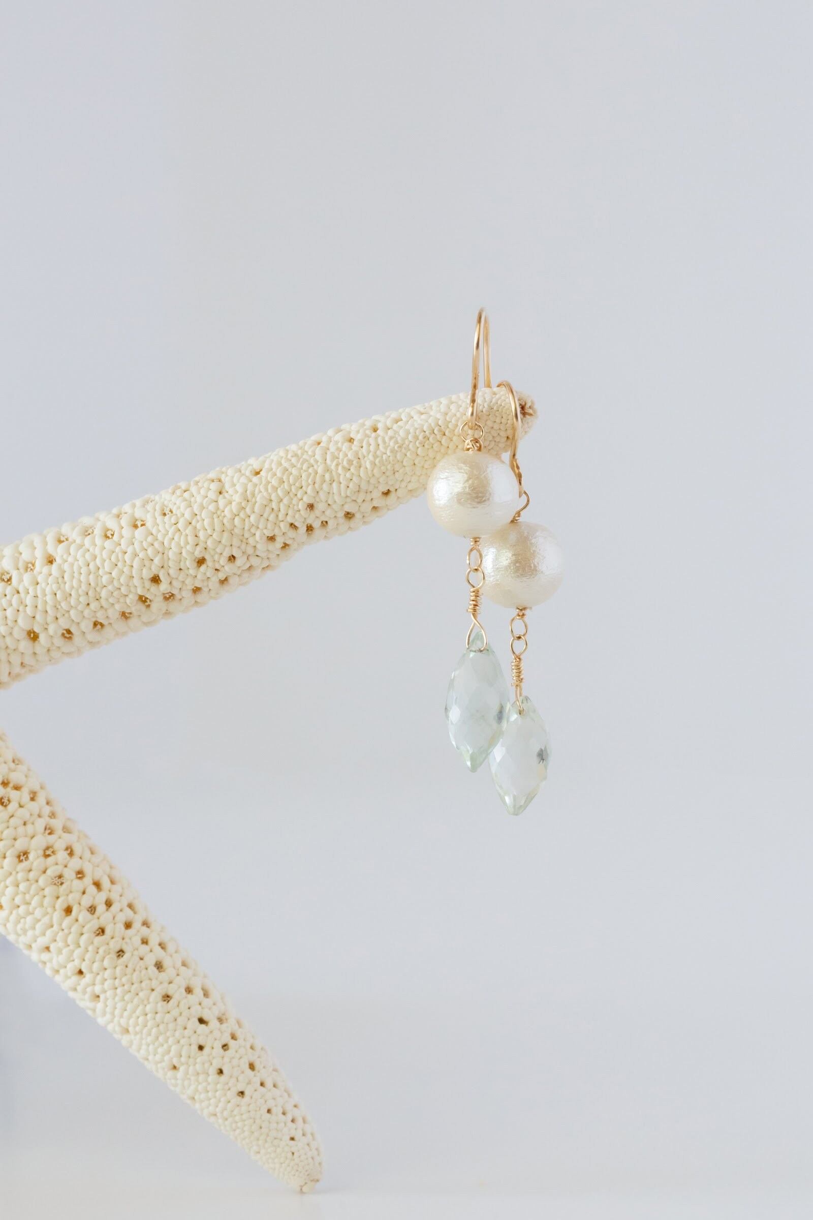 コットンパールとグリーンアメジストの組み合わせがさわやかながらも存在感のあるピアスです!冬のファッションにもその他の季節にも一年中通して似合うデザインです。
