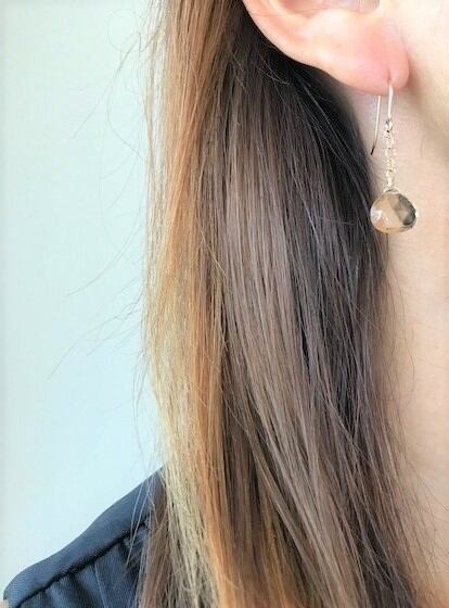 周囲の明るさによって透明に近い黄色にもブラウンにも見えるまさにシャンパンのようなクオーツのピアスです。さりげない輝きがどんなファッションにも似合います。