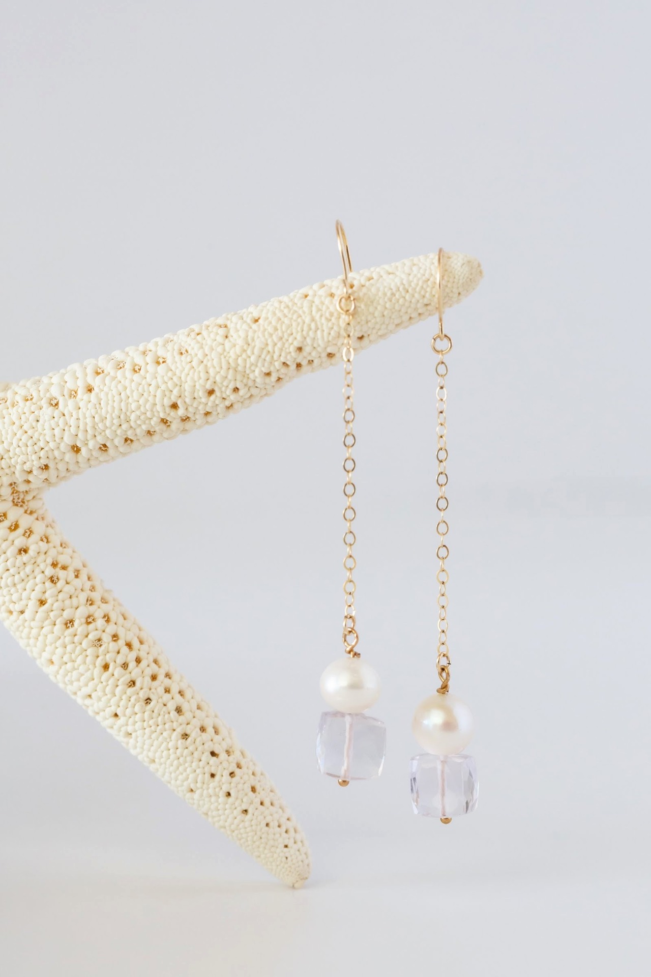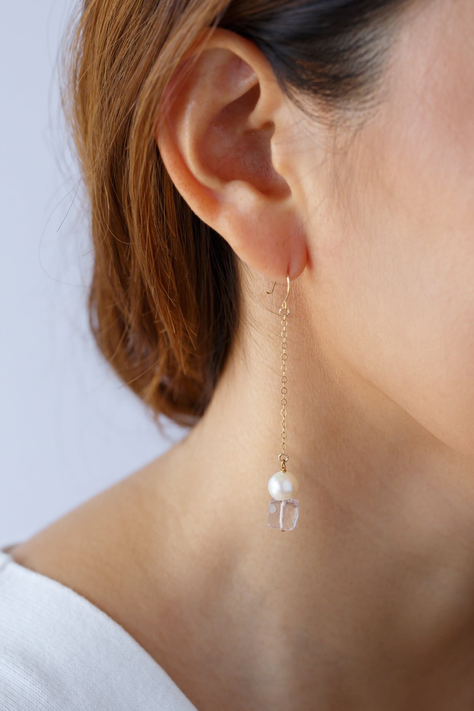 珍しいキューブ型のピンクアメジストとパールの組み合わせが可愛いながらも存在感のあるピアスです。