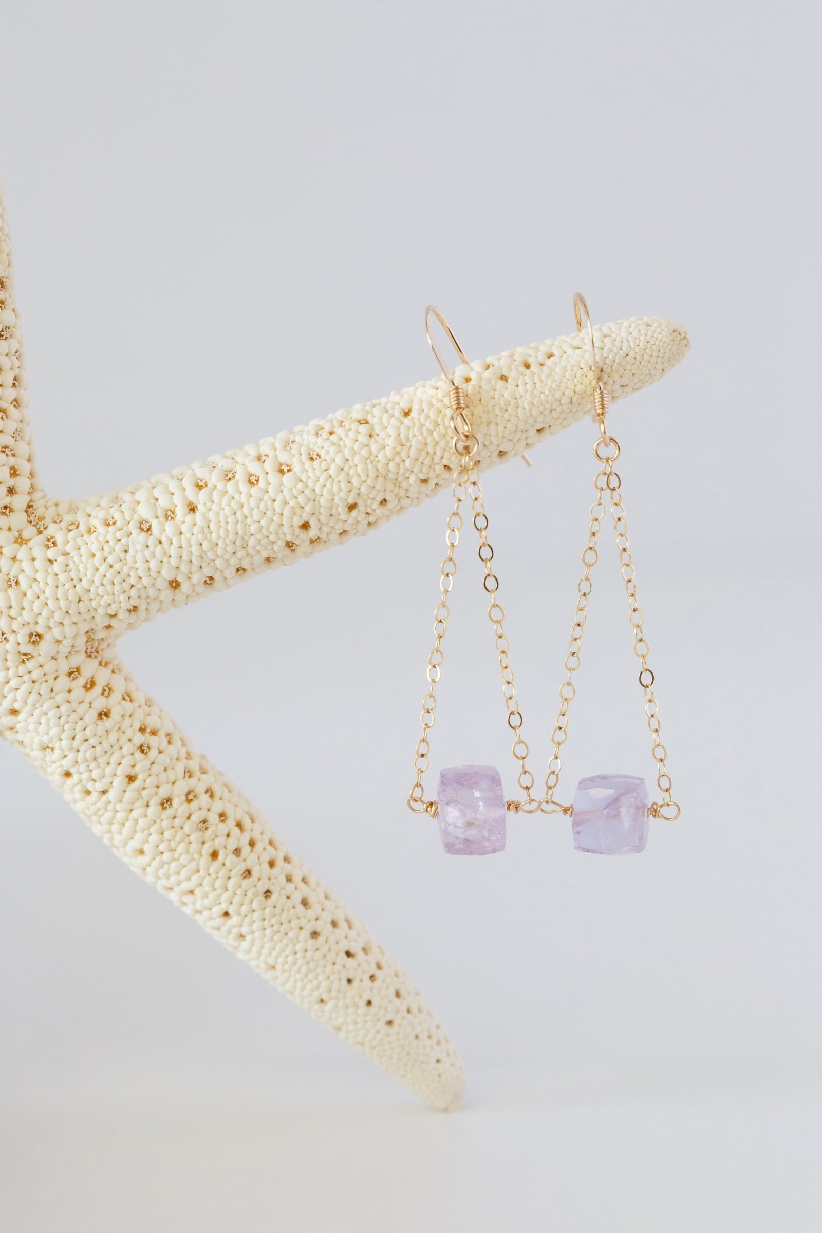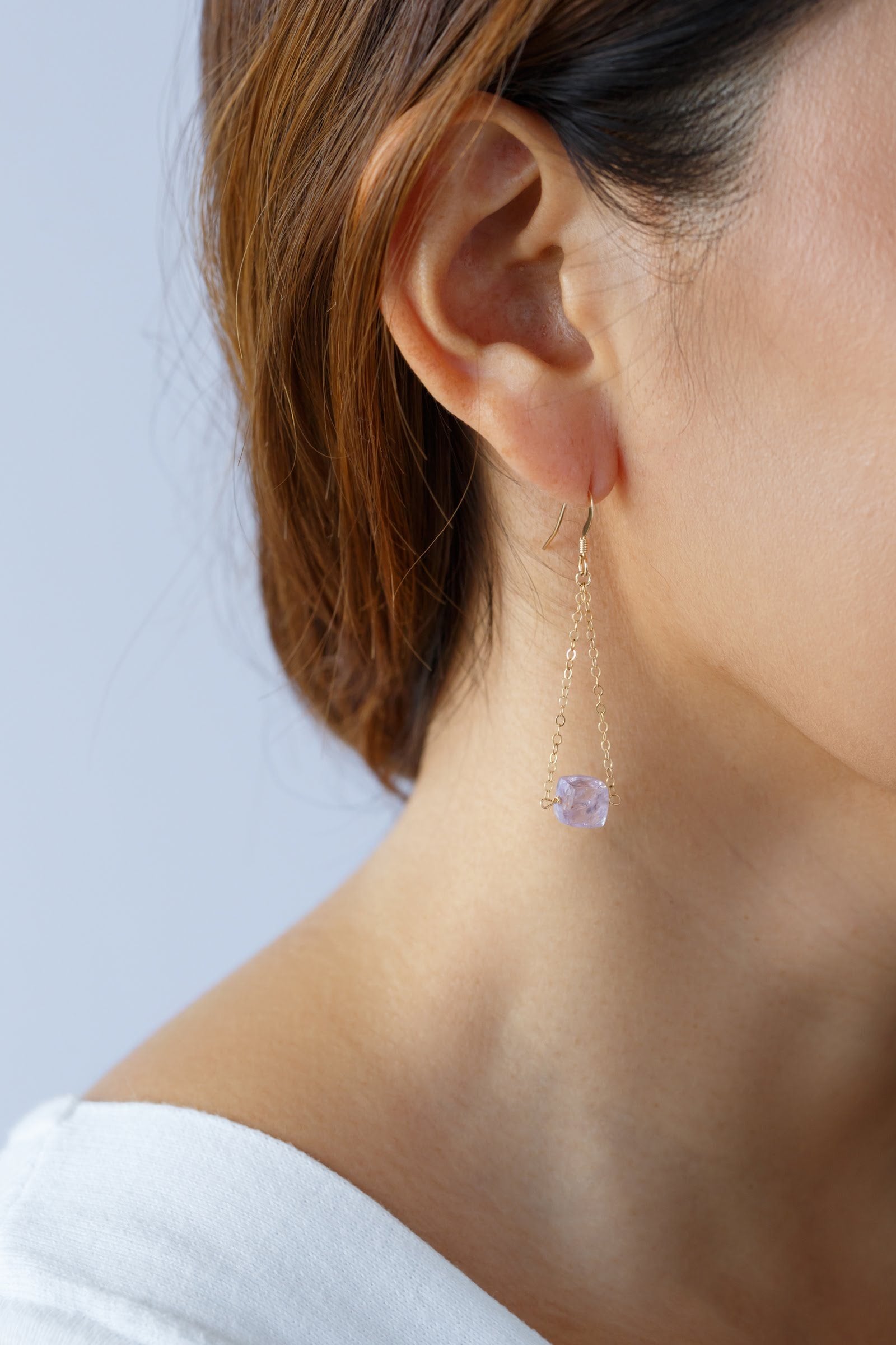 ピンクアメジストの珍しいキューブ型の石をいかしたブランコのように揺れるピアスです。