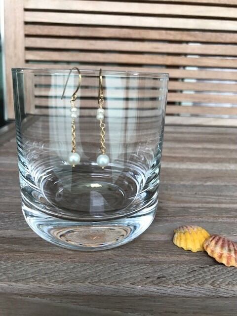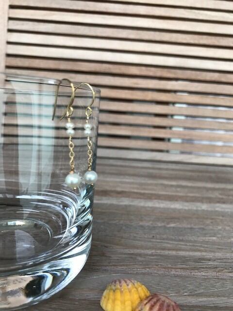 大きさの違う小粒のパールが3つついた可憐なピアスです。 全長 4cm (ピアスパーツ下から3cm) 素材 パール チェーン 14GF ピアスパーツ 14GF