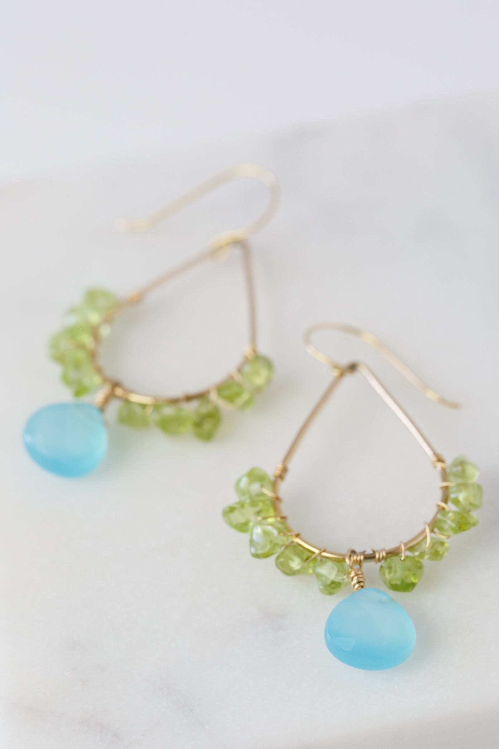 ペリドットの黄緑とカルセドニーのブルーが鮮やかな、ハワイやLAのビーチを彷彿とさせる夏らしいピアスです!