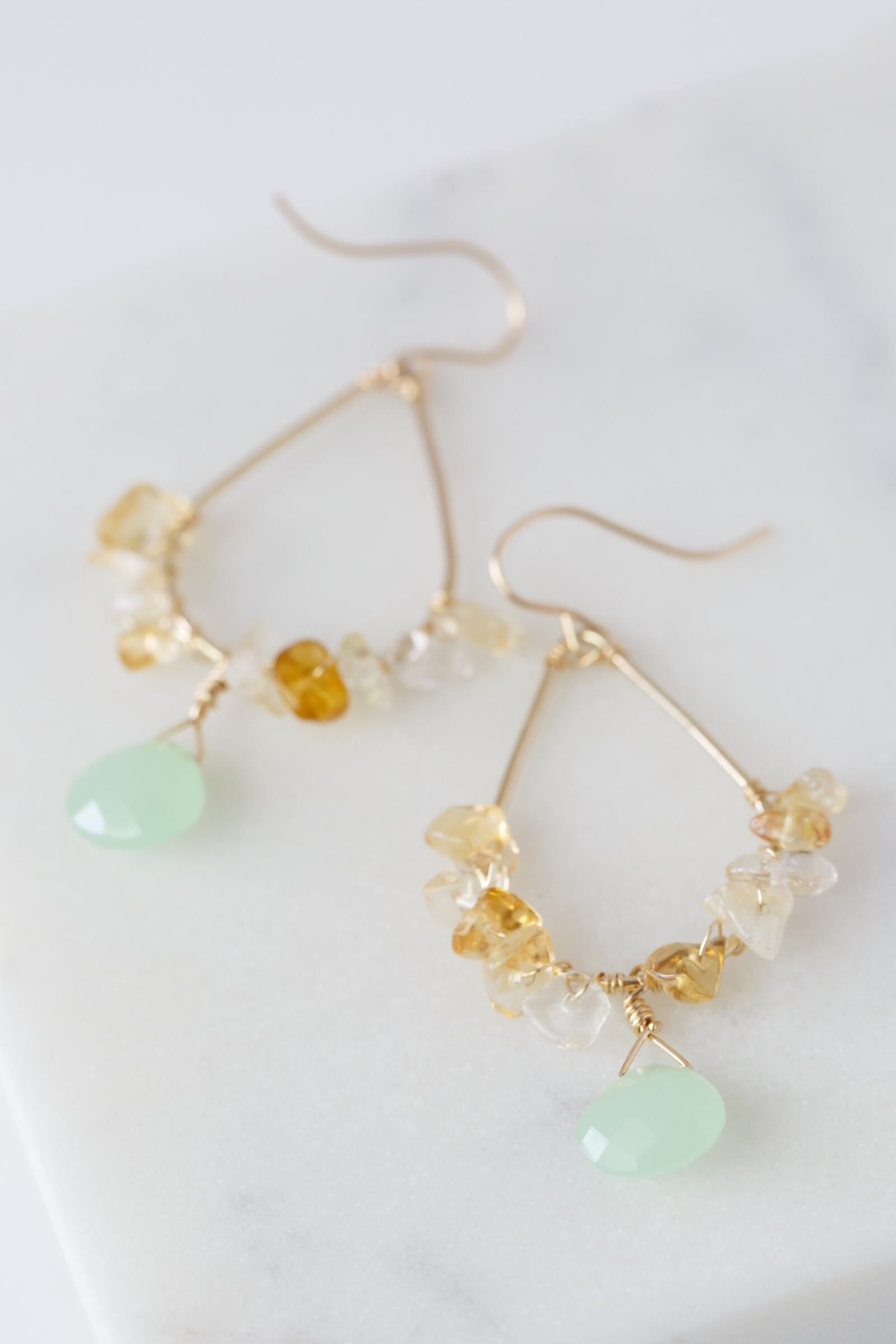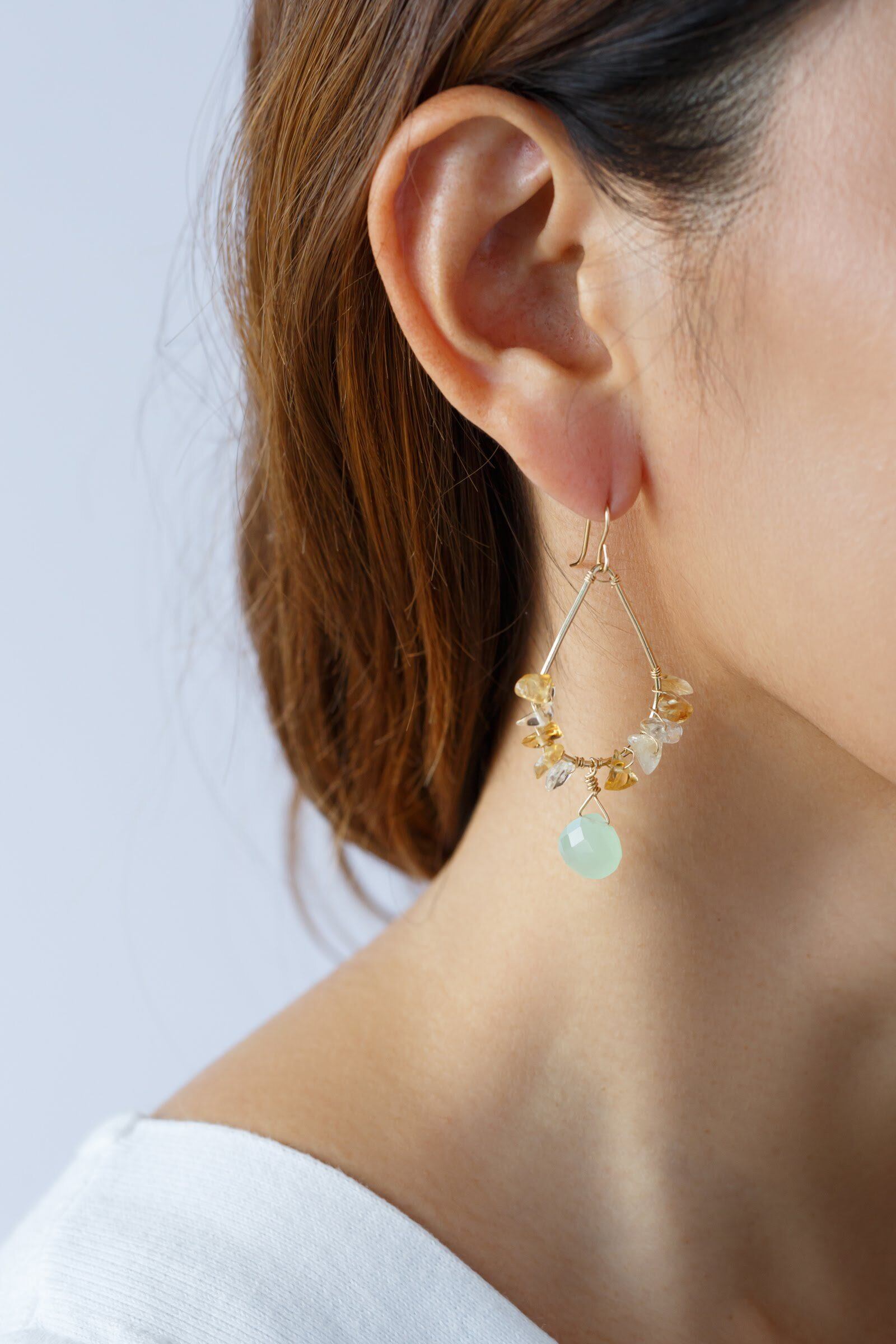 シトリンとグリーンカルセドニーのコンビがさわやかな、季節を問わずできるピアスです!このピアス一つでおでかけファッションが一気にグレードアップ!